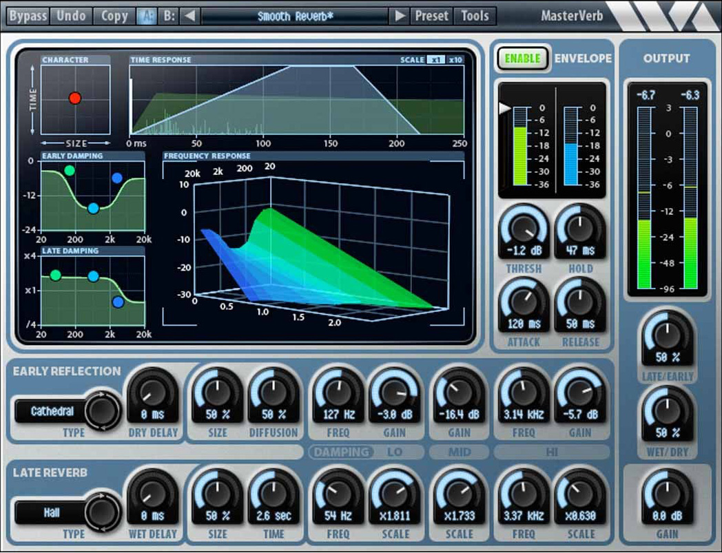 The next set of parameters, labeled Envelope, are very interesting indeed. In lieu of just offering a Gated Reverb effect, Wave Arts has been thoughtful enough here to include a fully-functioning gate with Threshold, Attack, Hold, and Release controls. Finally, we see our Output section which contains an Output meter, Late/Early Blend control, Wet/Dry blend and output gain.