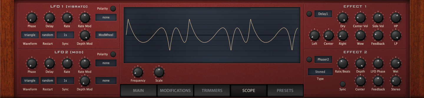 Regardless of the configuration you choose in the upper half of the panel, all patches can make use of the controls and modulation sources in the bottom half, including two LFOs, two effects processors, and an arpeggiator. Clicking the Modifications tab reveals even more modulation routing options, including virtual CV processing functions that allow you to manipulate control sources in a variety of useful ways. You can multiply or add signals together, quantize them to create stepped signals from smooth, or apply lag to smooth out square corners.
