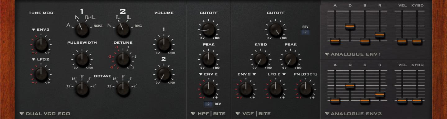 Together, the range of options spans from the analogue monosynths of the early 70s to digital modelling synths of the late 90s. At its very simplest, you could create a faithful rendition of your favourite Minimoog patch, but if you feel limited by the original ADR envelope generators, you can swap out either (or both) for the ADSR version. This flexibility also extends to a total of five oscillator modules (including VCO, DCO and digital oscillator emulations), three high pass filters (plus a feedback only circuit in this slot), five low pass filters (including a multimode filter) and three envelope types to choose from. For added authenticity, the Dual VCO and Bite VCF modules allow you to select different hardware revision options, each with their own distinct sonic character.