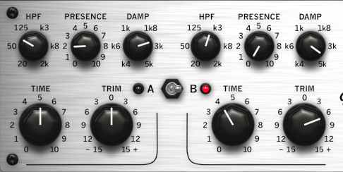 The EQ and Time controls are duplicated into an A and B channel. This allows you to set up two different sounding reverbs and quickly switch between them. You can also copy parameter settings between the two channels. This is handy as replicating parameter settings by eye can be tiresome.
