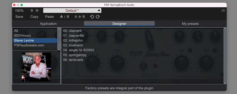 SpringBox’s preset browser allows users to browse factory presets and create their own. The number of factory presets is quite limited at only 21, but a spring reverb like SpringBox isn’t the kind of plugin that requires countless presets. Instead the presets that are there sound great and offer a good starting point for fine tuning. The factory bank even features six presets from legendary record producer Steve Levine who has worked with the likes of Ziggy Marley and Culture Club.